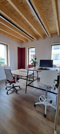- Premier étage : 1 espace de coworking avec 3 postes en open-space, 3 bureaux privatifs (ou à partager) et 2 salles de réunion.